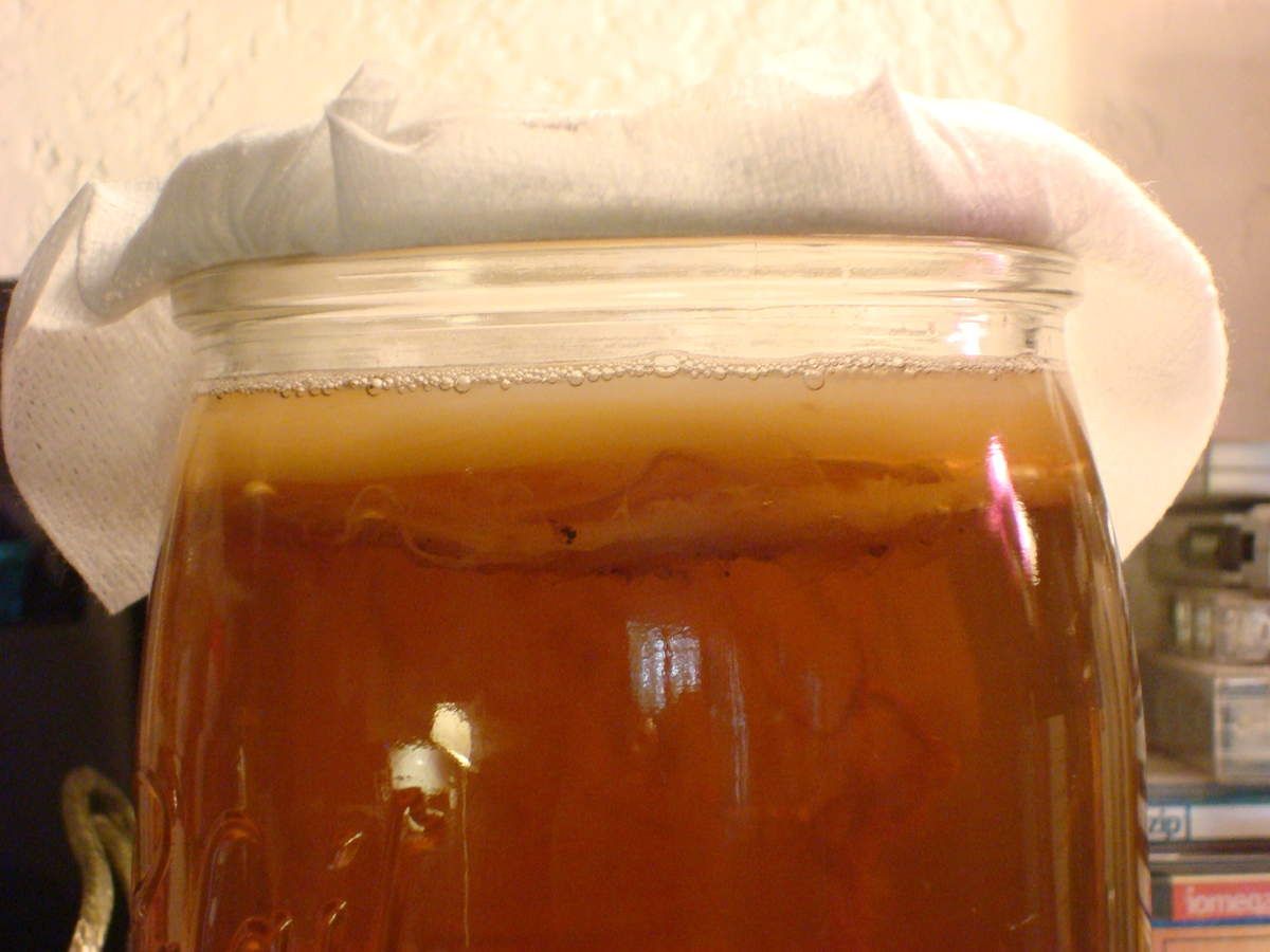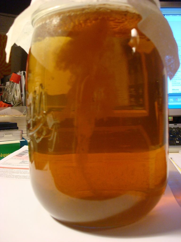 Lorsque le thé est froid, on glisse la souche, et on ferme avec une gaze et un élastique. Ainsi l'air peut circuler, mais les petites mouches qui sont souvent attirées ne pourront pas y mettre leurs pattes .. ni des oeufs.