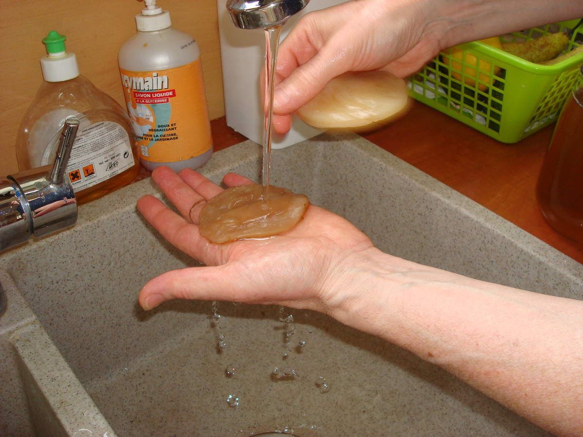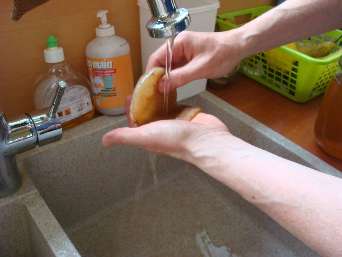 et on lui enlève les salissures qui s'y sont accrochées, filaments foncés et peaux.